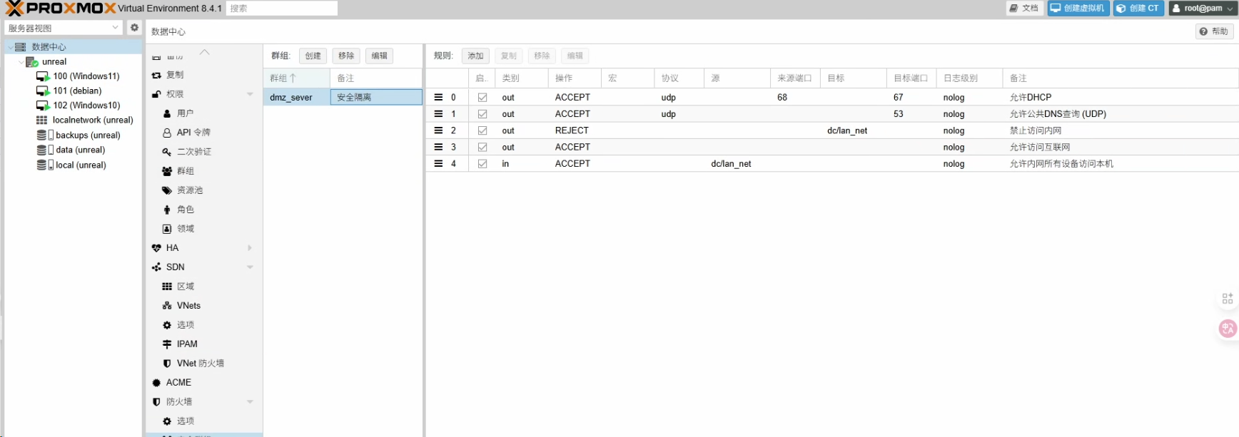 以下教程实现不依赖任何特殊的网络硬件或复杂的VLAN划分,仅利用PVE内置的防火墙,为一台虚拟机配置一套严谨而灵活的网络安全策略。最终目标是让这台虚拟机达到以下理想状态: