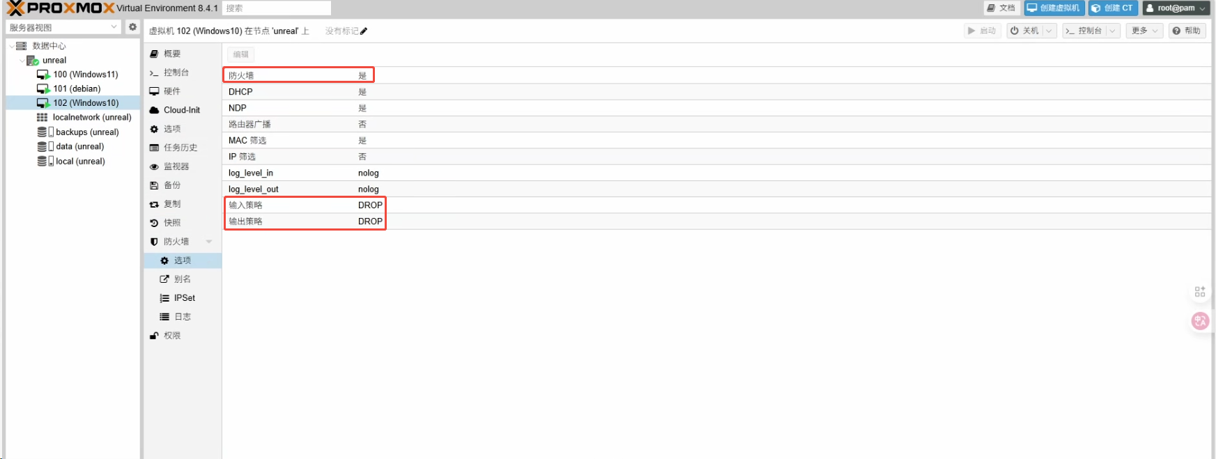 输入策略 (Input Policy)会自动设置为DROP。PVE有内置规则,并不会影响通过8006端口访问网页后台或通过22端口进行SSH连接。