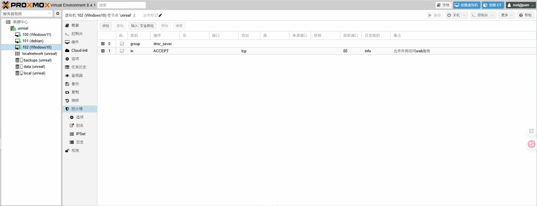 PVE防火墙会从上到下匹配规则,一旦匹配成功,后续规则将被忽略。如果添加后顺序不对,可以用鼠标拖拽调整。