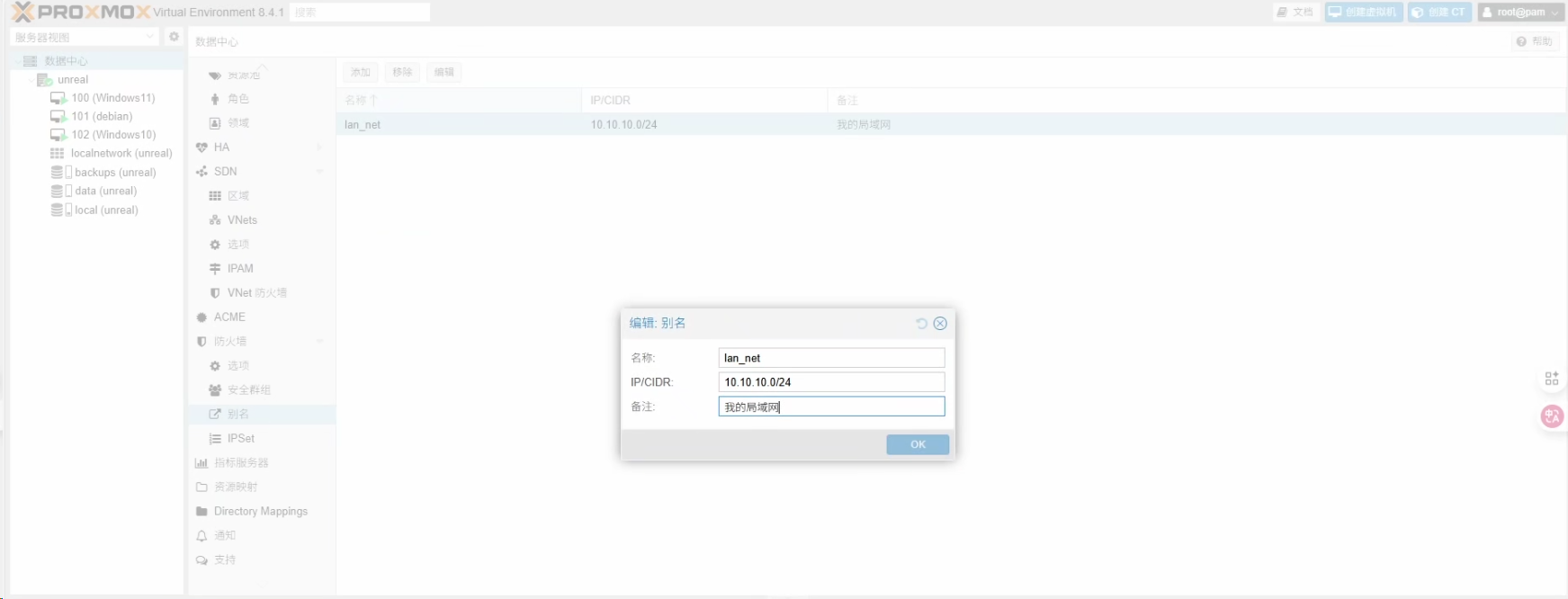 数据中心->防火墙->别名操作: