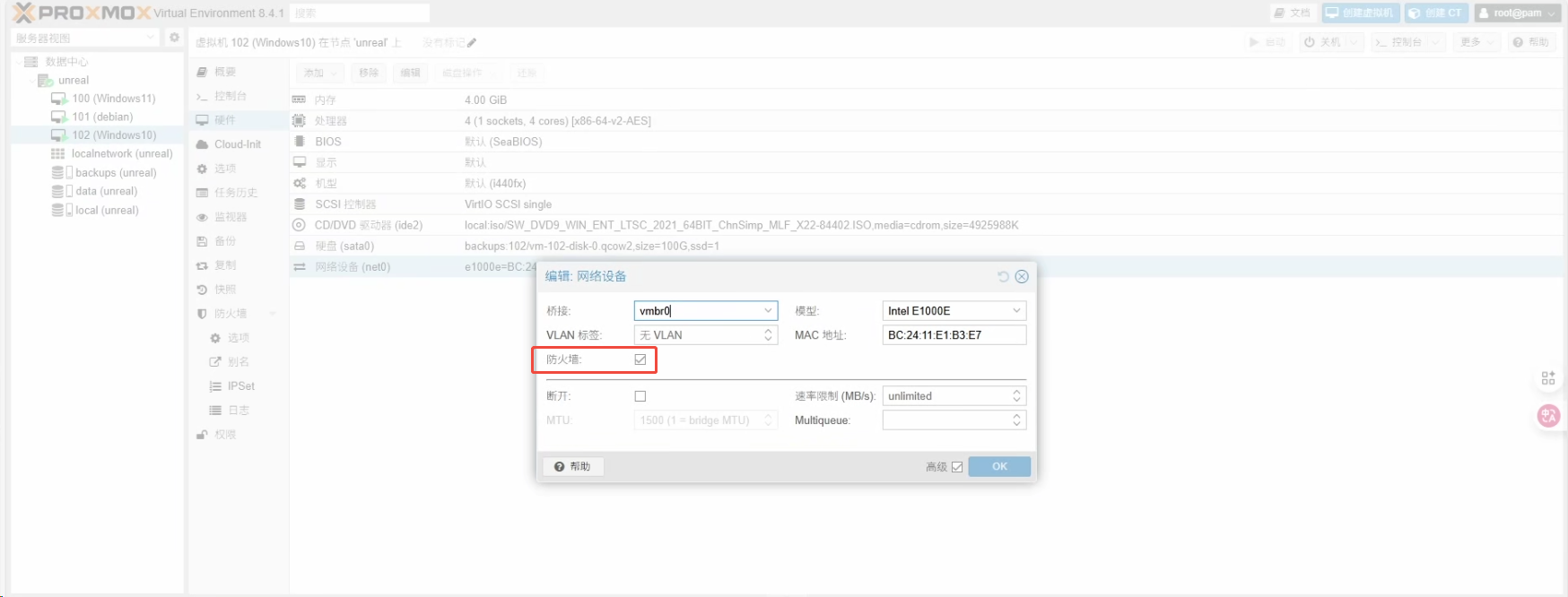 选择目标VM->硬件->网络设备(net0)操作: 双击网卡,勾选